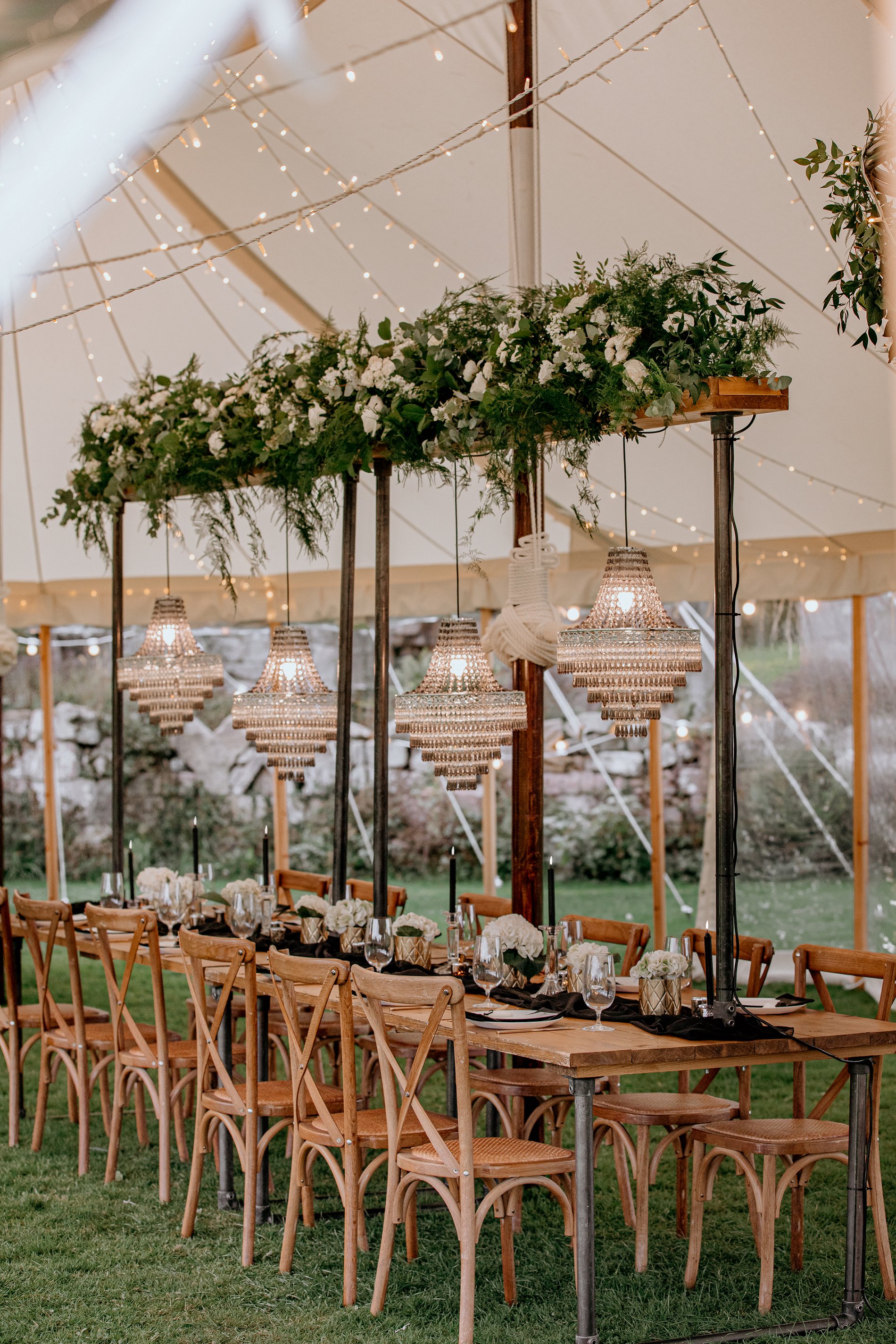 My Pretties UK styled and planned the shoot to perfection. Chandeliers in a marquee? YES! Typical Type supplied their custom built tables with statement lighting which paired beautifully with our monochrome styling, and Emma from The Petal Studios’ white roses and hydrangeas on the tablescape. They also created the most beautiful fairy-light canopy for the evening portion of our shoot.